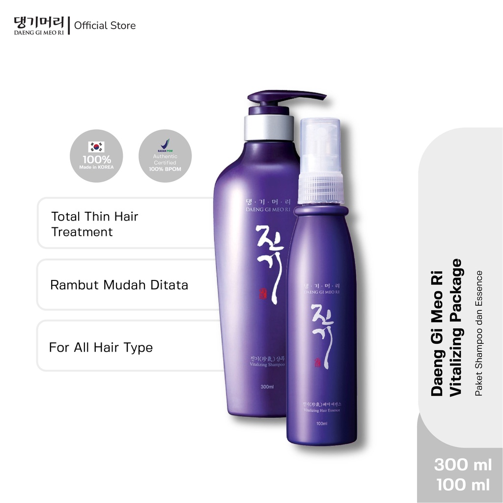 Daeng Gi Meo Ri - Paket Vitalizing Shampoo adalah kombinasi produk perawatan rambut yang terdiri dari Daeng Gi Meo Ri Vitalizing Hair Essence dan Daeng Gi Meo Ri Vitalizing Shampoo. Vitalizing Hair Essence memberikan kelembapan pada rambut kering, melindungi rambut dari sinar matahari, dan membuatnya lebih halus. Sementara itu, Vitalizing Shampoo mengandung 100% ekstrak herbal untuk mencegah kerontokan rambut dan menyuburkan rambut. Keduanya mengandung bahan-bahan alami seperti Air Changpo (Acorus calamus Linne) yang telah lama digunakan untuk perawatan rambut di Korea, menjadikan rambut lebih sehat, kuat, dan tumbuh subur. Produk ini memiliki sertifikasi CGMP, KFDA, dan BPOM, dan merupakan shampoo herbal asli dari Korea.