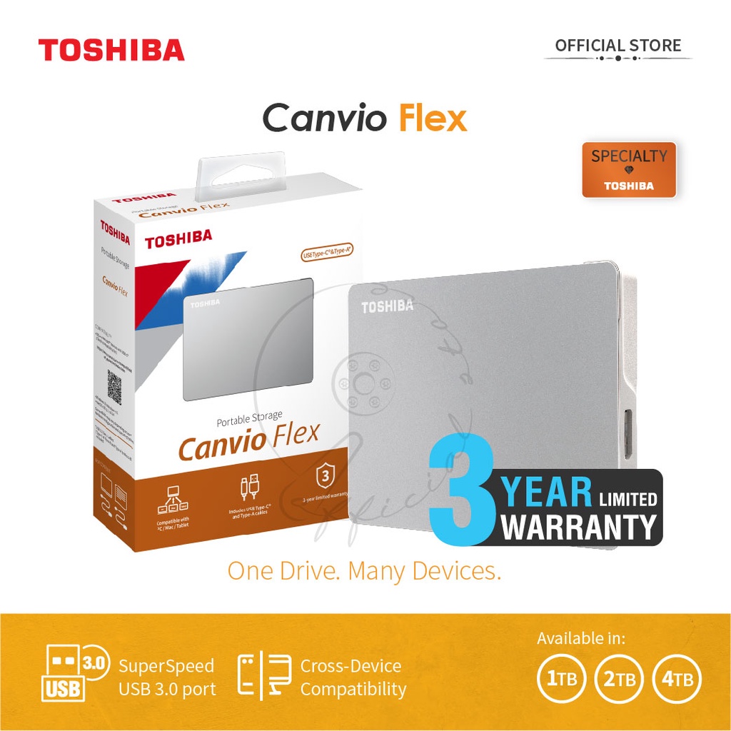 Nikmati kemudahan dan fleksibilitas untuk kebutuhan penyimpanan Anda dengan Canvio Flex, pendamping penyimpanan cerdas Anda. Tidak diperlukan adaptor USB - Sambungkan perangkat lama dan baru dengan mudah berkat kabel USB-A dan USB-C® yang disertakan. Untuk kapasitasnya sendiri sebesar 1 TB dengan garansi 3 tahun.