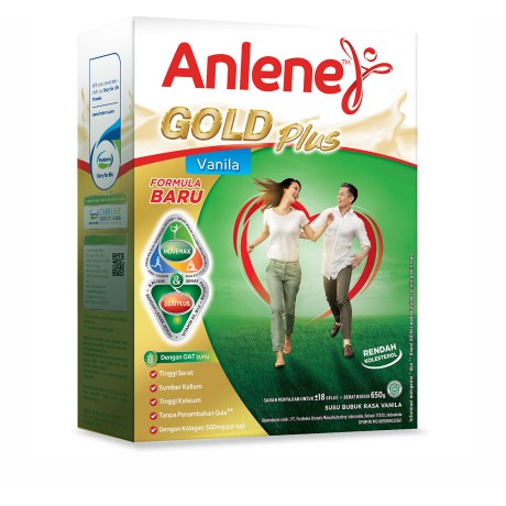 ANLENE Gold Plus adalah susu tinggi kalsium rendah lemak yang diformulasikan khusus untuk pria dan wanita berusia 51 tahun ke atas. Diperkaya dengan nutrisi penting seperti kalsium, vitamin D, magnesium, seng, dan protein, ANLENE Gold Plus memberikan dukungan yang optimal untuk tulang. Kandungan kalsium dalam ANLENE Gold Plus adalah dua kali lipat lebih banyak daripada susu biasa, untuk memastikan pembentukan massa tulang dan menjaga kepadatan tulang. Formula ini juga mengandung vitamin D untuk meningkatkan penyerapan kalsium, protein untuk memelihara struktur inti tulang dan mengatur regenerasi tulang, serta magnesium dan seng untuk memperkuat proses mineralisasi dan pembentukan tulang. ANLENE Gold Plus hadir dalam rasa vanilla dengan kemasan box berisi 250 gram, dan cocok untuk usia 51 tahun ke atas.