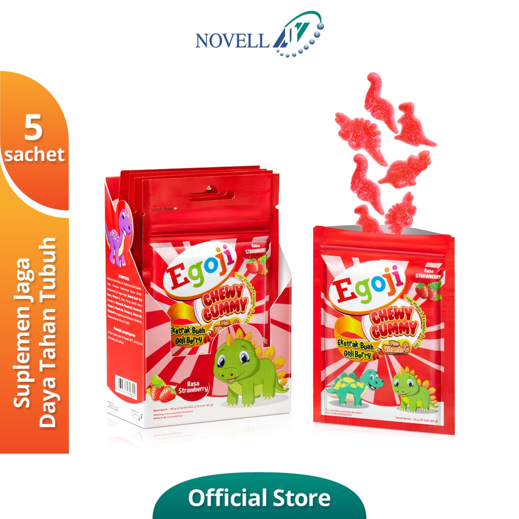 Suplemen ini mengandung pemanis gula dan sari buah alami yang tidak merusak gigi. Egoji Gummy hadir dalam kemasan yang praktis, yaitu UB (5 sachet @ 10 butir gummy) dan toples (20 sachet @ 10 butir gummy) dengan ukuran sachet 20 gram (2 gram x 10 butir). Suplemen ini membantu memelihara daya tahan tubuh dan mengaktifkan sistem kekebalan tubuh agar bekerja secara optimal.