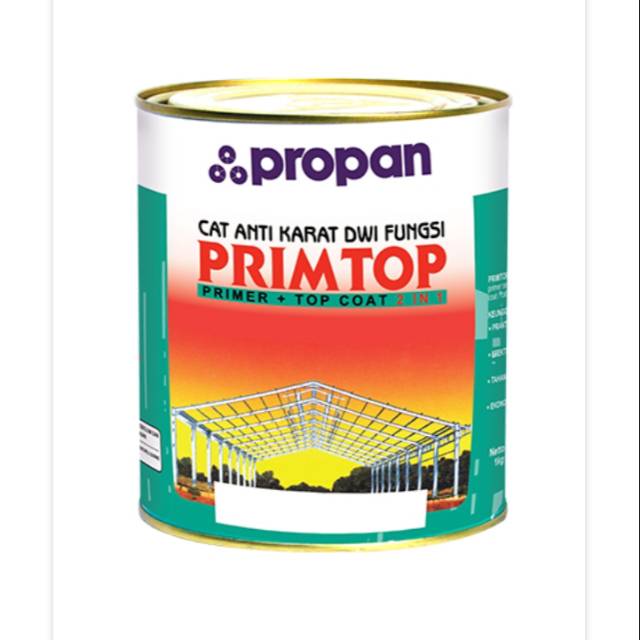Propan PrimTop 2 in 1 ini juga bisa jadi pilihan. Cat besi yang satu ini anti korosi. Anda bisa memakainya sebagai cat primer dan top coat. Produk ini sudah melewati penelitian dan pengembangan selama bertahun-tahun di laboratorium PT PROPAN RAYA oleh ahli kimia yang sudah berpengalaman di bidangnya. Cat ini begitu praktis karena hanya butuh satu cat untuk jadi primer anti korosi dan lapisan atas. Anda bisa mengaplikasikannya kuas, roller, atau sprayer. Cat ini tahan cuaca dan sangat ekonomis karena daya sebarnya luas.