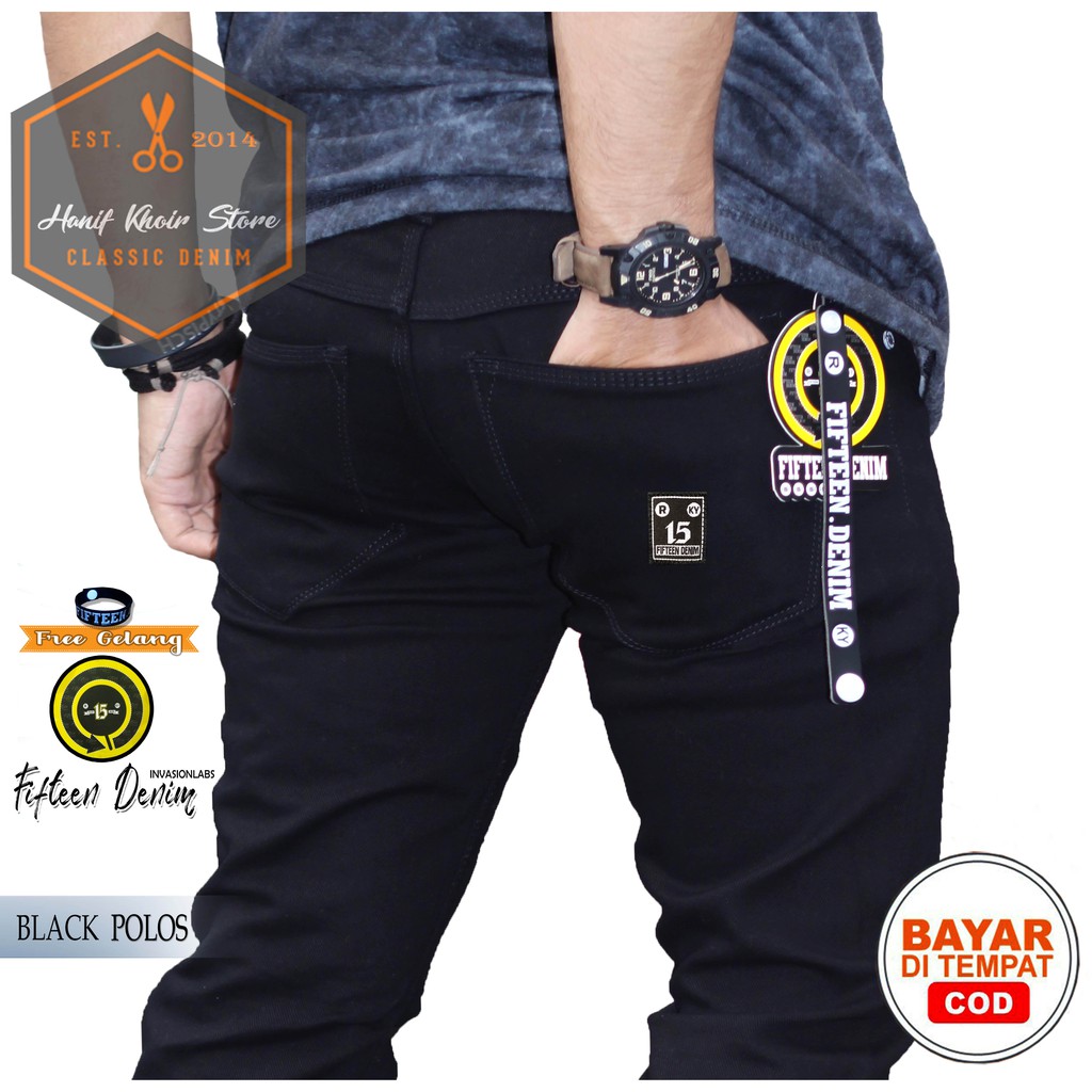 FIFTEEN DENIM Celana Jeans Pria juga merupakan salah satu celana yang dihadirkan oleh brand distro kenamaan. Celana jeans yang satu ini tersedia dalam ukuran S hingga XL. Produk yang satu ini nyaman digunakan kapan saja. Celana ini terbuat dari bahan denim stretch. Produk yang satu ini bahannya tebal dan lembut. Jahitan celana ini kuat dan rapi sehingga terkesan begitu elegan saat digunakan. Celana ini warnanya tak mudah luntur. Ada pilihan warna hitam, navy, dan biru muda untuk celana ini.