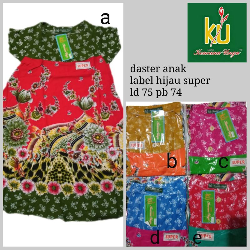 Daster klok batik Kencana Ungu ini cocok untuk anak perempuan. Dibuat dengan label hijau super, daster ini dilengkapi dengan 2 kancing hidup. Ukurannya adalah LD (lingkar dada) 74 cm dan PB (panjang baju) 75 cm. Daster ini diperkirakan cocok untuk usia 5-6 tahun, namun penting untuk memperhatikan ukuran pada setiap baju karena setiap anak memiliki ukuran yang berbeda. Dengan produk-produk berkualitas dari Kencana Ungu, Anda dapat menemukan beragam pilihan batik seperti kemeja, blouse, dress, mukena, celana, kimono, pakaian anak, dan daster.