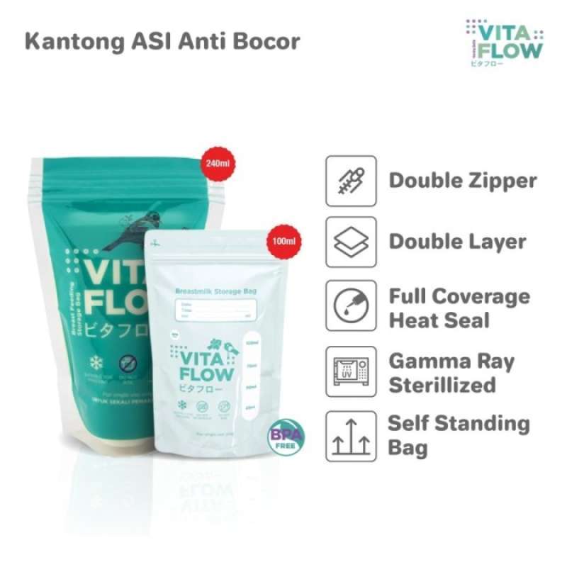 Kantong ASI ini telah disterilisasi menggunakan Teknologi Gamma-Ray, dan memiliki double zipper serta full coverage heat seal untuk menghindari risiko kebocoran ASI. Dengan VITAFLOW Breast Feeding Storage Bag, Anda dapat yakin bahwa nutrisi ASI bayi Anda akan tetap terjaga dengan baik.