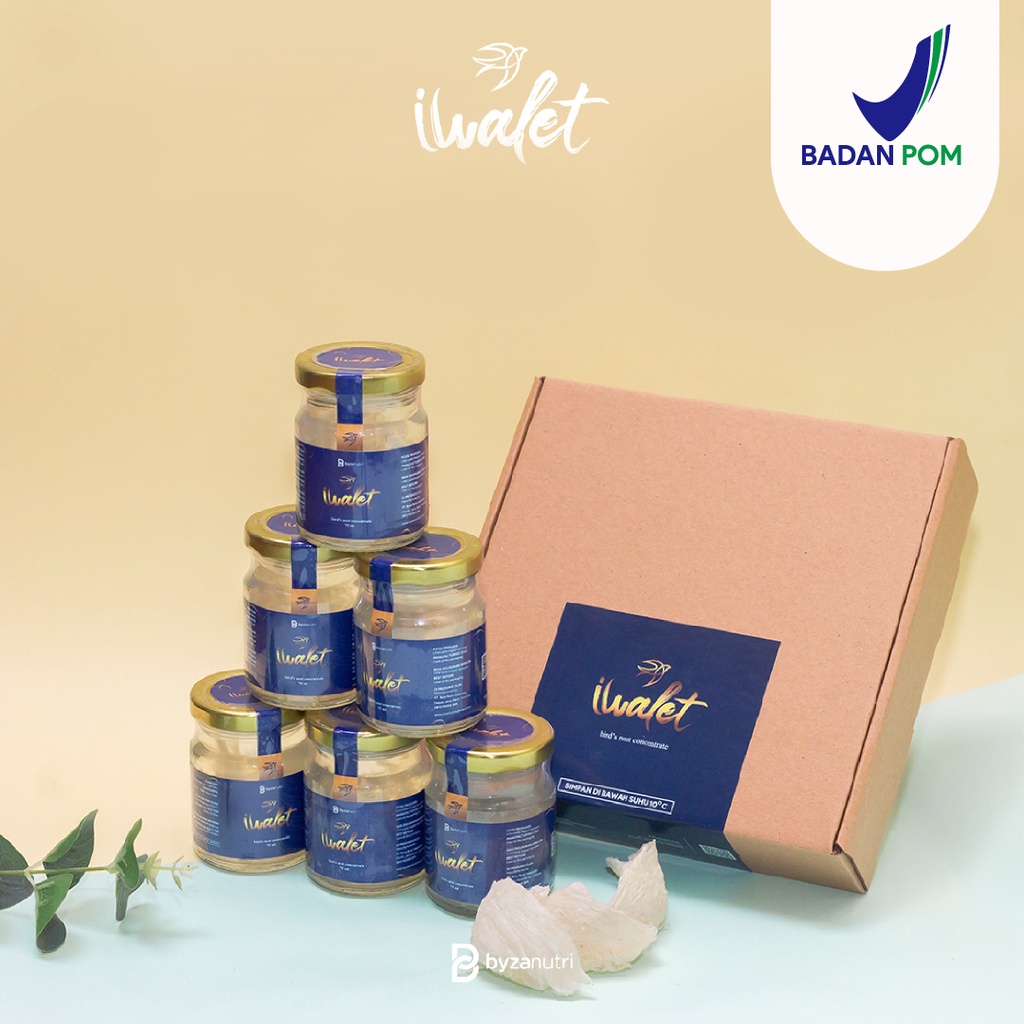 Iwalet Bird's Nest Concentrate Minuman Sarang Burung Walet adalah produk minuman dalam paket berisi 6 jar dengan ukuran 75ml per jar, dengan konsentrasi sarang burung walet sebesar 30%. Diproduksi setelah menerima pesanan dan dikirim pada hari yang sama, produk ini tidak menggunakan pengawet, harus disimpan di dalam kulkas, dan memiliki masa simpan 7 hari pada suhu ruangan, serta kedaluwarsa dalam 14 hari sejak tanggal pengiriman. Minuman ini terbuat dari Sarang Burung Walet asli yang diternak dan diolah oleh Byza Nutri Indonesia. Iwalet Bird's Nest Concentrate memiliki manfaat yang meliputi regenerasi sel, perawatan kulit, meningkatkan daya ingat, memulihkan tubuh setelah sakit, merangsang pertumbuhan sel, melawan kanker, serta menjaga dan meningkatkan kecerdasan otak.