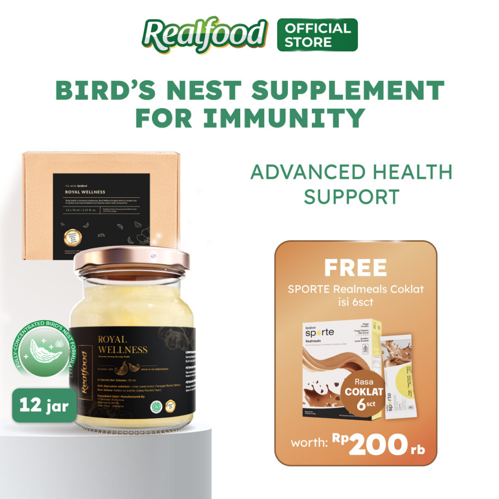 Realfood Royal Wellness Minuman Sarang Burung Walet adalah produk yang dapat dikonsumsi dalam program sehat selama 12 hari untuk menjaga kesehatan tubuh dengan formulasi fully-concentrated sarang burung walet. Produk ini mengandung asam amino, asam sialat, Epidermal Growth Factor (EGF), dan antioksidan yang memberikan berbagai manfaat, seperti menjaga paru-paru dan meredakan batuk, penyembuhan penyakit jantung dan gangguan pembuluh darah, serta meningkatkan konsentrasi kalsium dan mencegah osteoporosis. Saran konsumsinya adalah minimal 1 botol per hari saat perut kosong (pagi/malam hari) selama minimal 12 hari setiap bulannya untuk hasil yang maksimal.