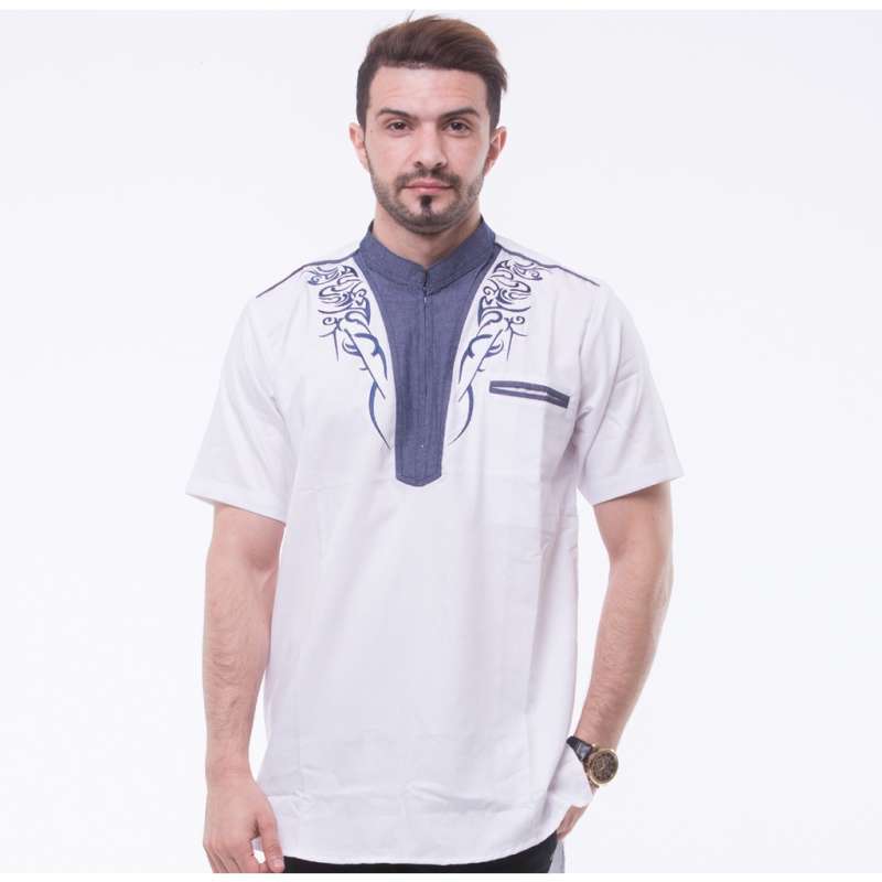 Baju Koko Chambray Fashion Muslimin Kurta Pria Dewasa Lengan Pendek Terbaru - Putih