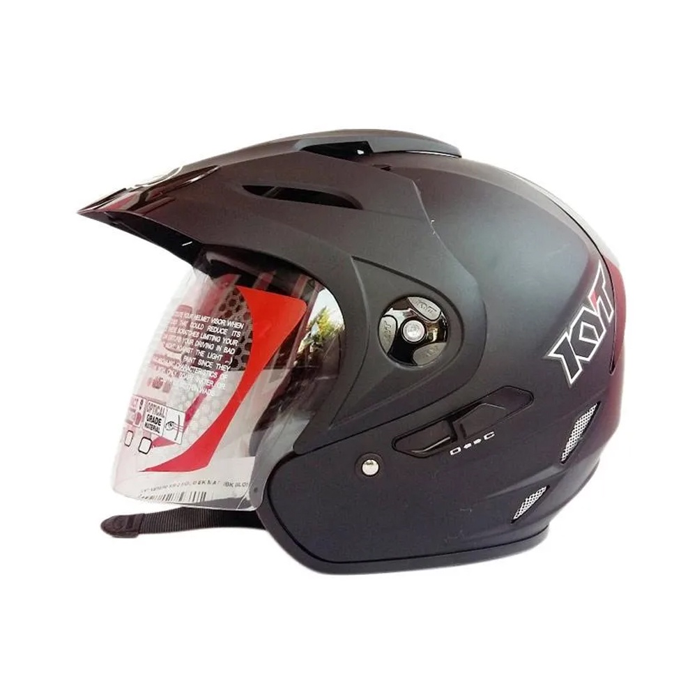 KYT Venom RR Solid Helm Half Face - Black Matt adalah helm half face yang sporty dengan bahan thermoplastic composite. Helm open face ini dilengkapi dengan fitur-fitur canggih, seperti teknologi anti maling, pengait keselamatan quick release, dan double visor. Dengan standar sertifikasi DOT dan SNI 1811-2007, helm ini memberikan perlindungan yang terpercaya saat berkendara. Selain itu, bagian dalam helm dapat dengan mudah dilepas dan dicuci, menjaga kebersihan dan kenyamanan saat digunakan.