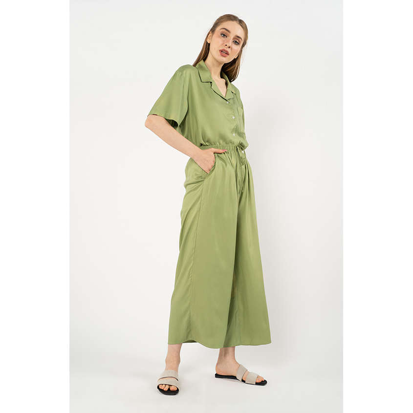 Cottonink - Green Saville Set sayang untuk kamu lewatkan begitu saja. Atasan dan bawahan ini akan menunjang aktivitas kamu selama di rumah. Produk atasannya memiliki kerah model V dengan potongan boxy. Ada kancing bukaan depan dan saku tunggal pada atasannya. Bagian bawahan berupa celana dengan pinggang karet yang elastis. Ada juga saku samping pada bawahannya. Kamu bisa memilih 4 ukuran yang tersedia dari S hingga XL.