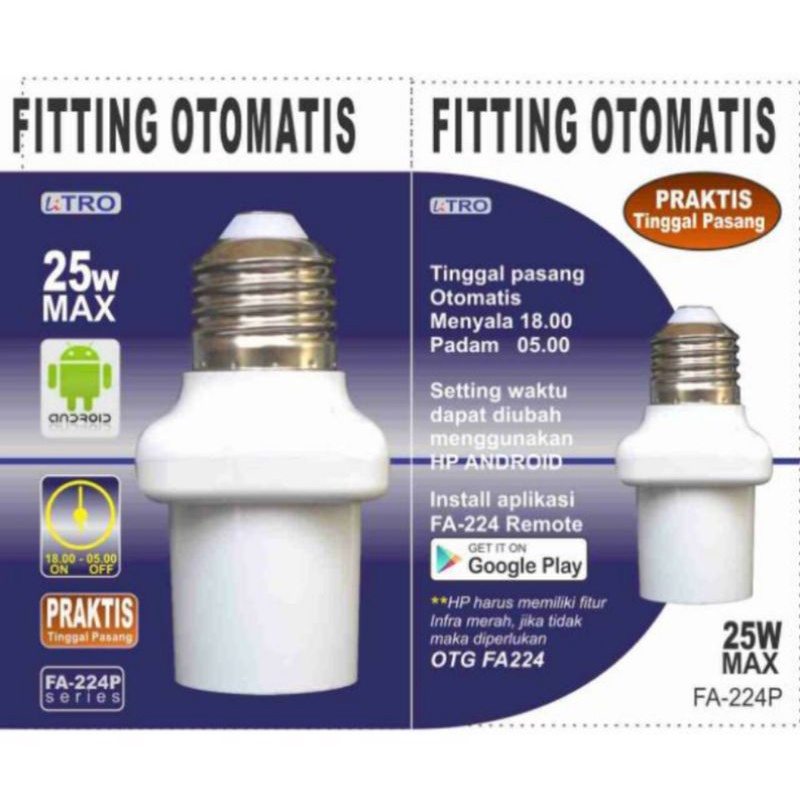 Fitting otomatis dengan timer untuk lampu adalah solusi praktis dalam penerangan ruangan. Fitting ini secara otomatis menyala saat suasana ruangan mulai gelap, membuatnya cocok untuk dipasang di luar ruangan atau saat Anda sedang tidak ada di rumah. Produk ini memiliki spesifikasi yang mencakup fitur timer, bukan sensor cahaya. Lampu akan otomatis nyala pada pukul 18:00 dan padam pada pukul 05:30. Jika Anda ingin mengatur waktu lainnya, Anda bisa menggunakan aplikasi FA-224 yang dapat diinstal melalui Playstore pada smartphone dengan fitur infrared. Cocok digunakan untuk berbagai jenis lampu di rumah, kos-kosan, ruko, atau rumah yang tidak ditempati.