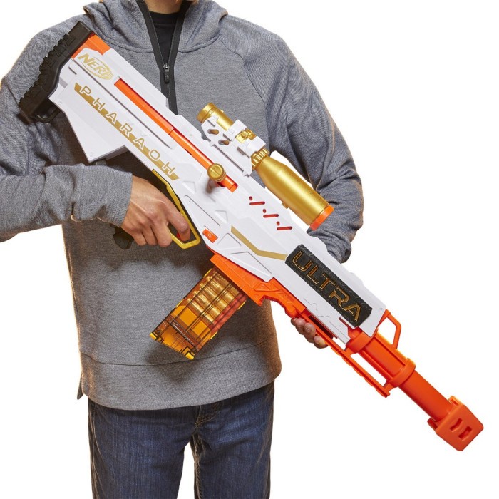 Hasbro Nerf Ultra Pharaoh Blaster adalah blaster Nerf Ultra yang menghadirkan performa dan desain canggih untuk jarak tembak yang ekstrem, akurasi, dan kecepatan. Dilengkapi dengan darts Nerf Ultra inovatif yang memiliki ujung penerbangan baru, teknologi Aerofin, dan busa Nerf Ultra. Blaster ini memiliki desain premium dengan aksen warna emas yang mencolok, dilengkapi dengan scope terintegrasi, dan kantong penyimpanan klip. Dalam paket ini termasuk 10 darts khusus berwarna emas. Nerf Ultra Pharaoh Blaster cocok bagi Anda yang suka bermain sebagai sniper dengan jarak tembak akurat hingga 36 meter, meskipun ukurannya agak berat dan besar untuk anak usia 8 tahun.