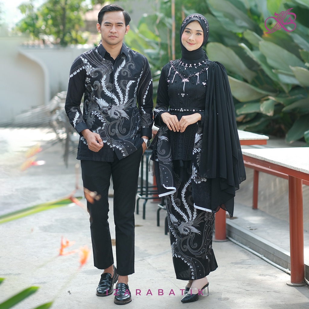 Jika kamu sedang mencari kebaya couple dengan desain megah khususnya yang berwarna hitam, kamu pasti akan jatuh cinta dengan produk ini dalam sekali lihat. Inayah Hitam - Gaun Kebaya Batik Modern ini berwarna dasar hitam dengan kain batik yang bermotif uliran rumit daun. Kebaya brokat pada set ini secara sekilas terlihat sederhana, namun di saat bersamaan sangat megah. Hal ini karena untaian kain tile yang cukup tebal pada bagian bahu. Pada bagian dada sendiri dihiasi dengan payet mutiara, bambu, dan batu Jepang yang disusun dengan tidak berlebihan.