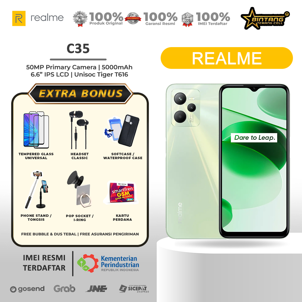 HP Realme C35 adalah ponsel yang cocok untuk pengguna dari berbagai usia, termasuk remaja, dewasa, dan orang tua. Ponsel ini memiliki kinerja yang baik, layar yang luas, dan fitur kamera berkualitas, sehingga cocok untuk aktivitas sehari-hari seperti browsing internet, media sosial, streaming video, dan bermain game ringan. Baterai tahan lama juga menjadikannya cocok untuk pengguna yang sering menggunakan ponsel untuk waktu yang lama tanpa harus sering mengisi daya. HP Realme C35 dilengkapi dengan layar IPS LCD berukuran 6,6 inci dengan kecerahan hingga 600 nits, chipset Unisoc Tiger T616 dan prosesor octa-core, serta pilihan RAM 4GB/6GB dan penyimpanan internal 64GB/128GB yang dapat diperluas menggunakan kartu microSDXC. Kamera belakang triple 50MP dengan fitur PDAF, HDR, dan panorama juga hadir untuk menghasilkan foto berkualitas tinggi. Ponsel ini juga memiliki baterai berkapasitas besar 5000mAh dengan dukungan fast charging 18W, sensor sidik jari yang terletak di sisi, serta sensor-sensor seperti accelerometer, gyro, proximity, dan compass untuk kenyamanan pengguna.