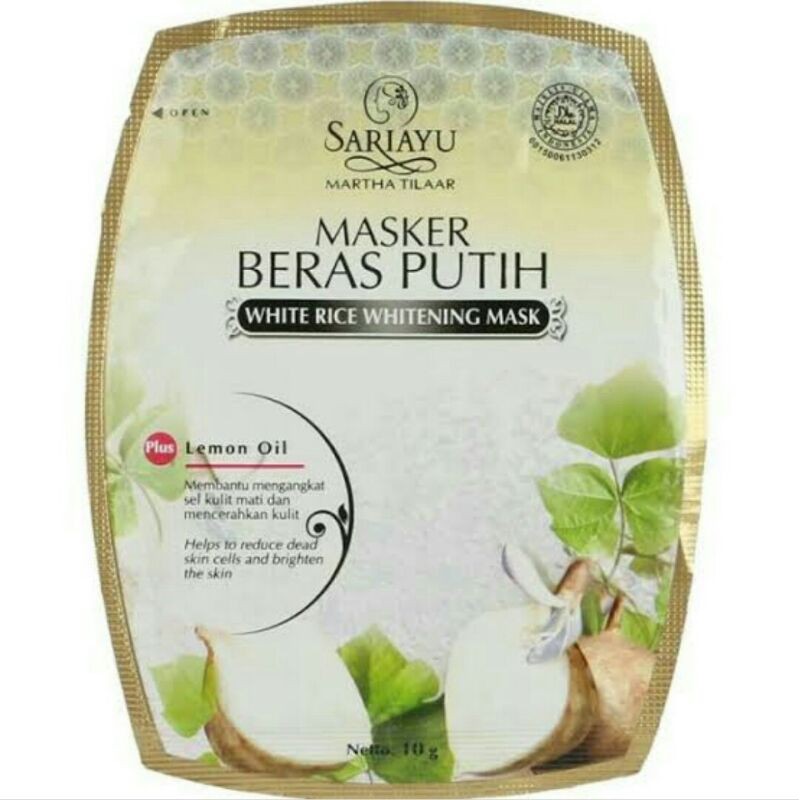 Sariayu Masker Beras Putih mengandung beras putih dan bengkuang untuk menjaga kelembapan dan mencerahkan kulit wajah. Formula alami dengan tambahan pati bengkuang, ekstrak selasih, lemon oil, dan AHA membantu menyegarkan kulit serta mengangkat sel kulit mati. Manfaat beras putih, yang kaya akan vitamin dan mineral, menjadikan masker ini efektif mengencangkan, melembapkan, dan mengurangi bintik hitam pada kulit.