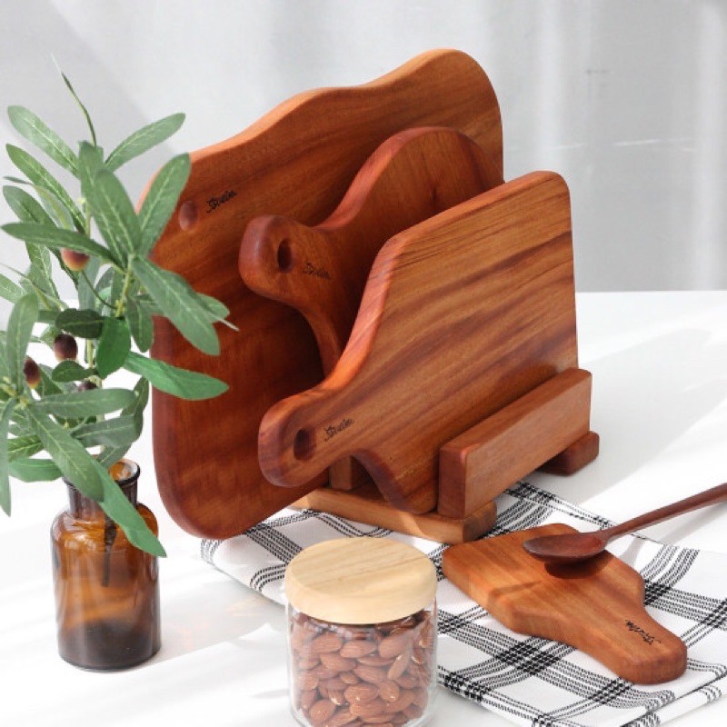 Bahannya menggunakan kayu mahogany berkualitas yang diekspor ke Korea Selatan. Bentuk talenan tersedia dengan berbagai ukuran dan pilihan yang bisa disesuaikan.
