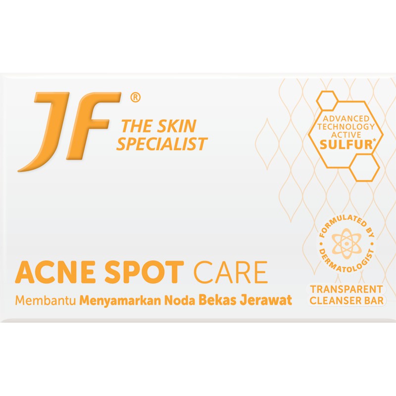 JF Acne Spot Care Transparent Cleanser Bar adalah sabun yang dapat membantu memudarkan bekas jerawat berkat kandungan whitening agent-nya. Produk ini mampu melawan pigmentasi di kulit dan membuat noda bekas jerawat menjadi lebih pudar. Selain itu, sabun ini juga mengandung sulfur, sodium citrate, dan niacinamide yang efektif melawan jerawat, termasuk jerawat yang sedang meradang.