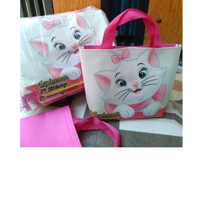 Bosan dengan bentuk tas yang itu-itu saja? Tas Ultah Custom Anak Model Trapesium bisa jadi pilihan. Tersedia dengan ukuran 30x20 cm yang menggunakan perekat. Sedangkan alasnya berukuran 18x10 cm dengan bahan spunbond jenis king 75 gsm. Menariknya tas ini juga bisa dicuci dan dipakai berulang.