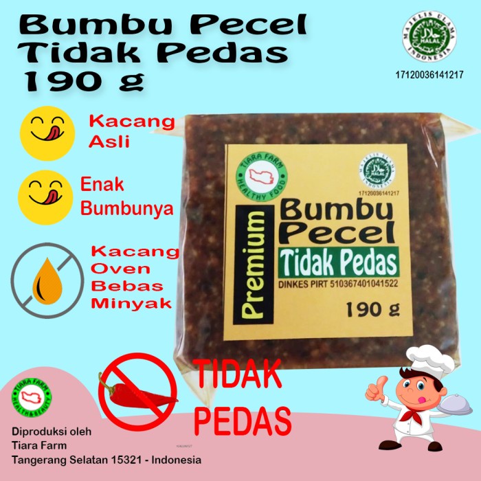 Bumbu pecel Tiara farm terbuat dari kacang asli tanpa campuran singkong. Bumbu pecel premium ini memiliki 3 variasi level rasa yaitu tidak pedas, sedang dan pedas. Hal ini memberikan kemudahan untuk Anda agar bisa untuk memilih sesuai selera Anda.