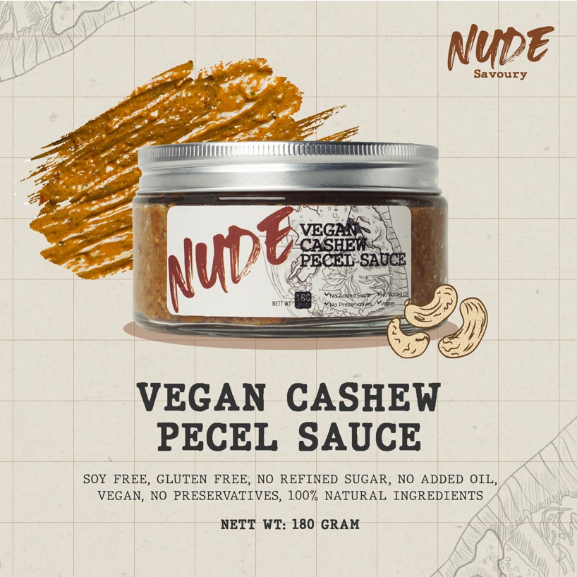 Nude Vegan Cashew Pecel Sause merupakan bumbu pecel yang dibuat dari mente, kacang tanah, bawang putih, bawang merah, kelapa, gula aren organik, cabai, asam jawa. Bumbu pecel ini bebas kedelai, bebas gula, tanpa minyak tambahan, vegan, tanpa pengawet dan 100% bahan alami.