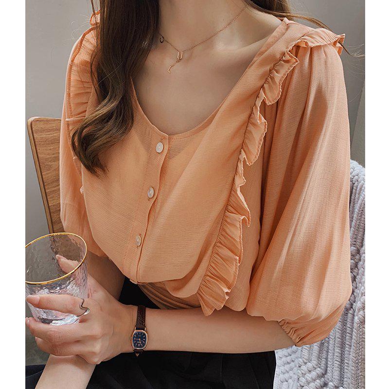 Gaya pakaian dengan detail gelombang-gelombang alias ruffle juga adalah favorit gaya pakaian wanita di Korea saat ini. Detail ruffle ini bisa terdapat di bagian kerah, ada yang menjadi bagian tangan, hingga bagian ekor atasan Anda.
