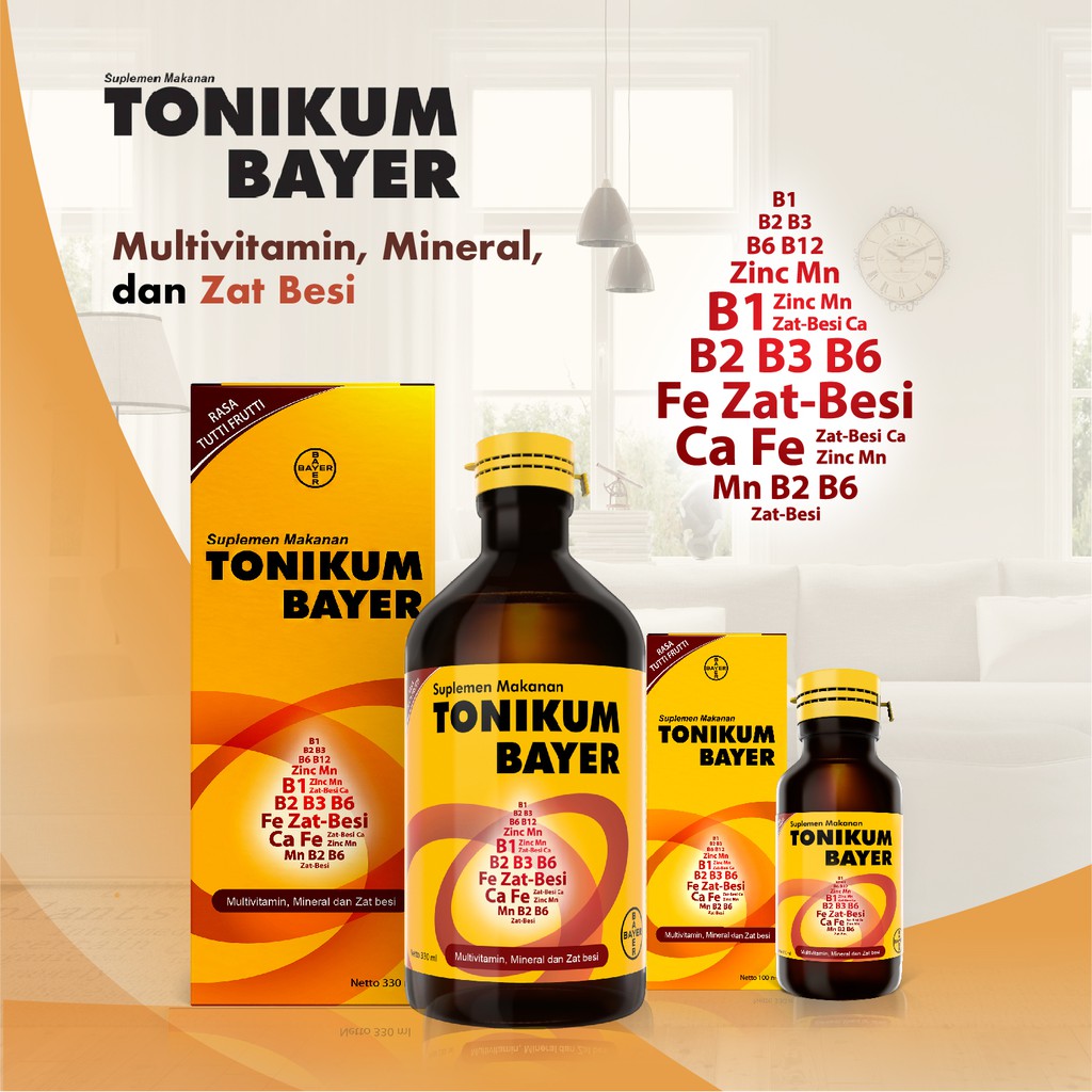 "Tonikum Multivitamin Bayer mengandung zat besi, kalsium, mangan, zinc, serta berbagai vitamin B seperti B1, B2, B3, B6, dan B12. Vit C sebagai penstabil dengan pemanis buatan seperti Natrium sakarin, Natrium siklamat, dan Sorbitol. Multivitamin ini membantu memenuhi kebutuhan gizi selama kehamilan, menstruasi, pertumbuhan, usia lanjut, dan menjaga kesehatan umum. Harap perhatikan peringatan penggunaan khusus untuk bayi di bawah 1 tahun dan mengandung kadar ethanol maksimum 0.5%. Penggunaan dewasa, wanita hamil, dan anak-anak 6-12 tahun disarankan 1 sendok makan (15ml) sehari, dengan pengocokan sebelum konsumsi."