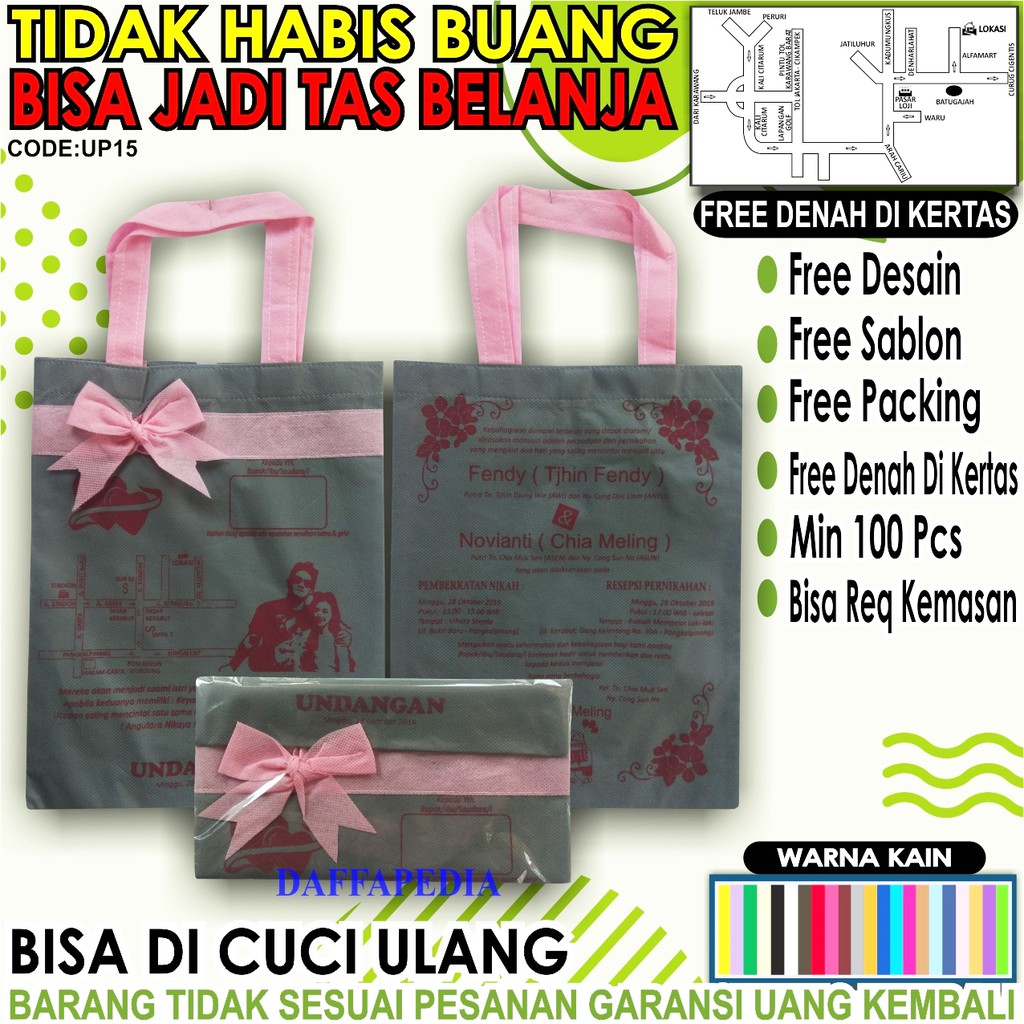 Undangan ini juga bisa sekaligus berfungsi sebagai suvenir. Ukuran dari totebag ini adalah 23 x 30 cm. Terbuat dari bahan spunbond, tasnya tahan lama digunakan. Kamu bisa menambahkan denah juga pada tulisan di tas ini. Desainnya juga bisa diubah sesuai keinginan kamu. Untuk warnaya juga bisa dipesan sesuai keinginan. Pemesanan minimal 100 pcs. Produk akan dikerjakan dalam 6 sampai 10 hari.