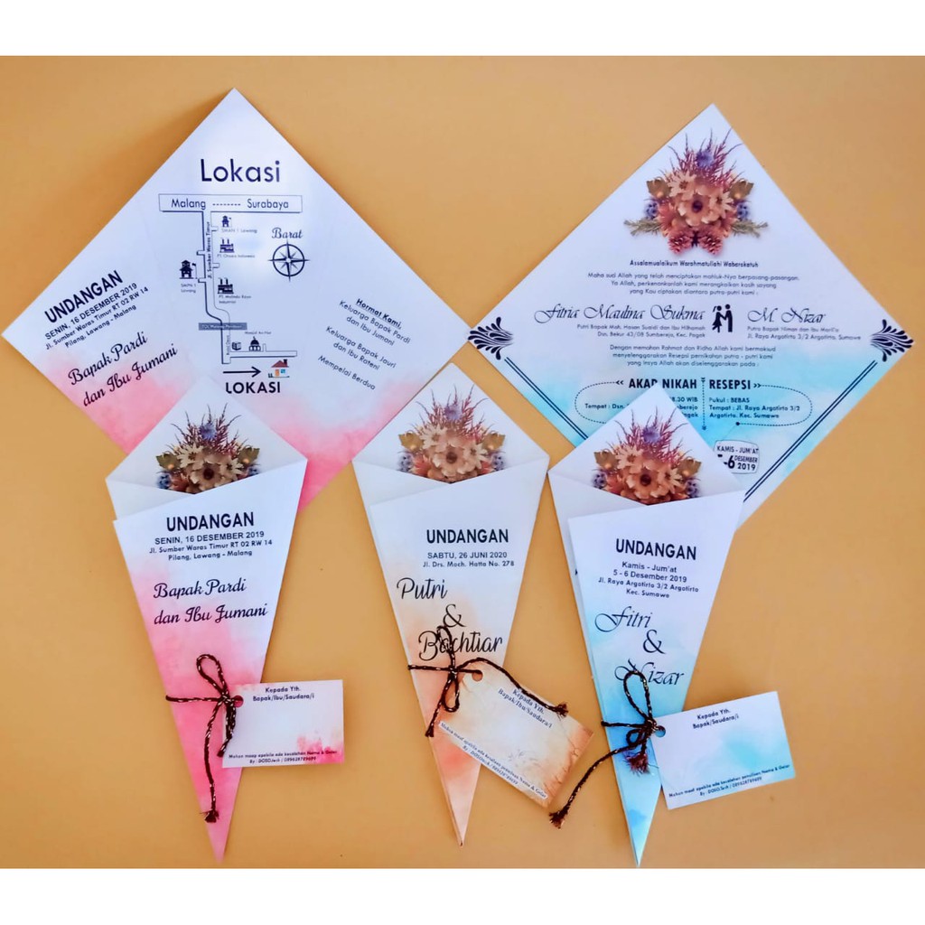 Undangan Pernikahan Unik Model Cone keren juga untuk kamu gunakan. Undangan yang satu ini lengkap dengan tali, plastik, dan label nama. Kesan undangannya berbeda dari biasanya. Paduan warna simpel namun menawan membuatnya menarik perhatian. Paduan warnanya adalah pink, biru, dan oranye. Namun kamu bisa request warna lain jika kurang suka.