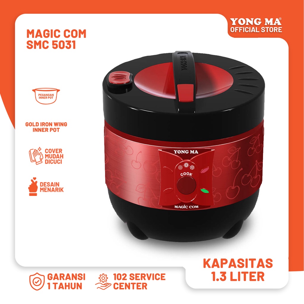 YONG MA Magic Com SMC 5031 adalah rice cooker multifungsi dengan desain praktis dan beragam fitur unggulan. Dapat digunakan untuk memasak, menghangatkan, dan mengukus dengan daya 350 Watt. Terbuat dari stainless body dengan warna dinamis dan motif indah. Fitur keamanan seperti tombol magnet dan saklar pencegah panas berlebihan memberikan kepercayaan saat penggunaan. Sistem pemanasan yang beragam, yaitu piring pemanas untuk memasak dan sistem pemanas 3D untuk penghangatan, membuat nasi tetap lezat dan tahan lama. Terdapat juga multi pot untuk mencuci beras dan memasak makanan kukusan. Dengan kapasitas 1.3 L, cocok untuk memasak nasi hingga 6 orang, tersedia dalam tiga warna menarik yaitu hijau, hitam, dan maroon.
