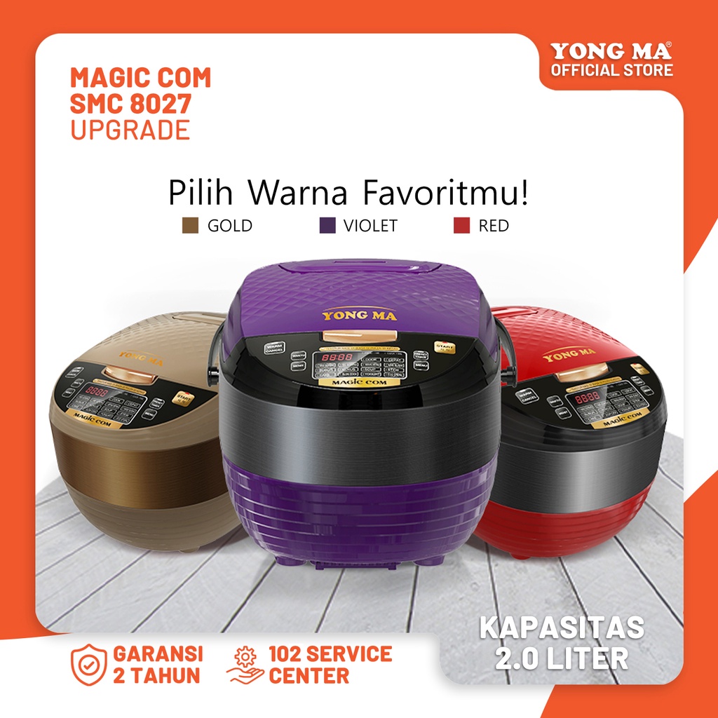YONG MA Magic Com SMC 8017 adalah rice cooker multifungsi dengan inner pot gold ceramic dan ECO ceramic coating. Fitur Cook & Warm dengan tombol 'One Touch' memudahkan penggunaan, dan teknologi 3D Heating membuat nasi tetap hangat dan lezat. Fungsi alarm memberi tahu saat memasak selesai, dan ada pegangan pada Inner Pot serta fitur Preset untuk mengatur waktu memasak. Magic Com ini memiliki kapasitas 2 liter atau setara dengan 11 porsi makan. Selain memasak nasi, juga dapat digunakan untuk nasi goreng, mie goreng, slow cook, eco steril, cake, soup, stew, bubur, kukus, dan beras merah dengan pilihan tekstur nasi. Paket pembelian juga termasuk berbagai aksesoris yang berguna.
