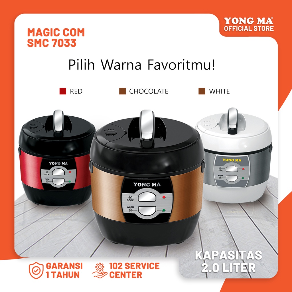YONG MA Magic Com SMC 7033 adalah rice cooker elegan dengan kapasitas 2 liter, cocok untuk memasak nasi hingga 11 porsi makan. Panci Inner Pot dengan Ceramic Coating memberikan nasi yang lebih sempurna, sehat, mudah dibersihkan, dan ramah lingkungan. Pegangan anti panas pada panci memberikan kenyamanan dan keamanan saat penggunaan. Teknologi Cook & Warm 3D Heating membuat nasi tetap tahan lama dan lezat, dengan pemanasan dari sisi atas, body, dan heating plate. Dilengkapi juga dengan Multi pot untuk mencuci beras dan memasak makanan kukusan. Tersedia dalam dua warna hitam dan putih, rice cooker ini menjadi asisten ideal untuk menyajikan nasi enak untuk keluarga.