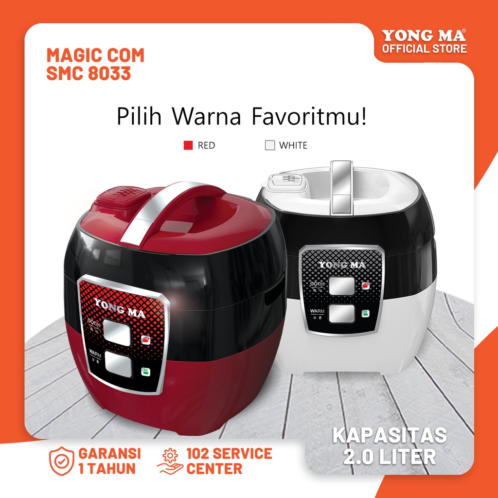 YONG MA Magic Com SMC 8033 adalah rice cooker multifungsi dengan kapasitas 2 liter, cocok untuk memasak, menghangatkan, dan mengukus. Inner Pot dilapisi Ceramic Coating untuk menghasilkan nasi yang sempurna, sehat, dan anti lengket. Dengan pegangan anti panas, push button switch, dan chrome button yang elegan, proses memasak menjadi mudah. Tombol magnet dan saklar pencegah panas berlebihan menjamin keamanan saat penggunaan dan penghangatan otomatis setelah memasak selesai. Dengan motif tenun pada penutup Inner Pot, desain rice cooker ini terlihat elegan. Tersedia dalam dua warna, merah dan putih, serta dilengkapi dengan Multi pot, rice scoop, dan cup measurement, YONG MA Magic Com SMC 8033 adalah pilihan rice cooker praktis dan aman untuk dapur Anda.