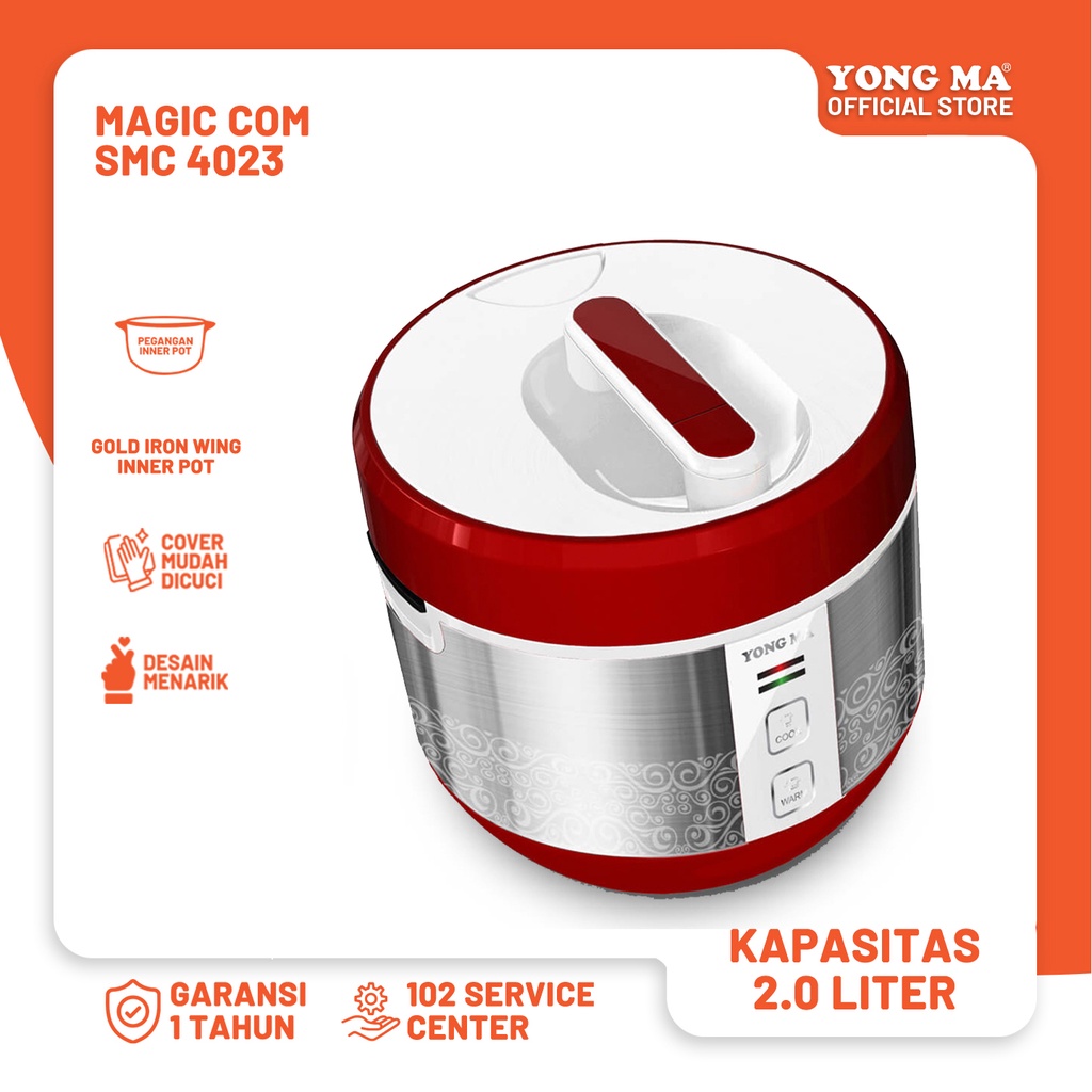 YONG MA Magic Com SMC 4023 adalah rice cooker dengan kapasitas 2 liter dan daya 400 watt. Desain stainless body memberikan kesan kualitas tinggi dengan nuansa warna dinamis dan motif indah. Dilengkapi dengan pegangan Inner Pot yang memudahkan penggunaan, push button switch, dan secret button untuk kemudahan memasak. Terdapat tombol magnet yang berfungsi sebagai penghangat setelah proses memasak selesai. Saklar pencegah panas berlebihan dan pengamanan ganda dirancang untuk keamanan pengguna. Sistem pemanasan menggunakan piring pemanas, dan sistem penghangatan menggunakan pemanas 3D (3 sisi). Tersedia Multi pot untuk mencuci beras dan memasak makanan kukusan. YONG MA Magic Com SMC 4023 hadir dalam tiga pilihan warna, yaitu merah, putih, dan ungu, memberikan kenyamanan dalam memasak dan menghangatkan nasi.