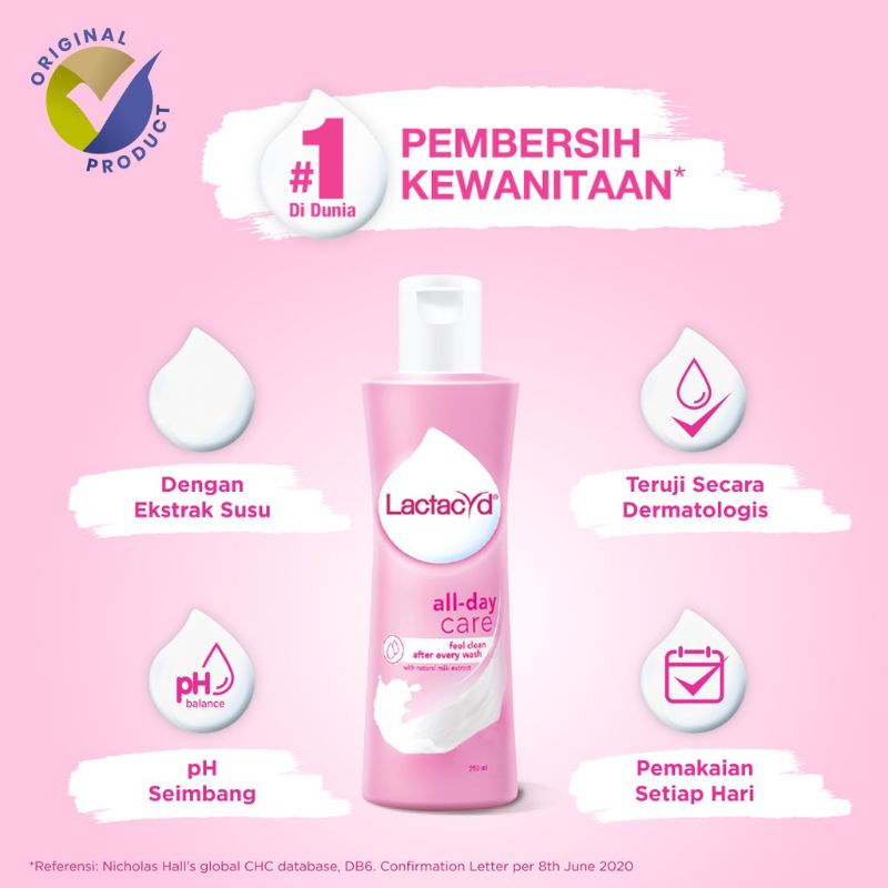 Lactacyd All Day Care adalah pembersih kewanitaan nomor 1 di dunia yang membersihkan dengan lembut dan melindungi area kewanitaan dari gatal dan iritasi. Terbuat dari ekstrak susu alami, produk ini memiliki pH seimbang yang tidak mengubah pH alami area kewanitaan. Sudah diuji secara dermatologis dan aman digunakan setiap hari. Cara penggunaannya pun mudah, cukup kocok sebelum digunakan, tuangkan secukupnya ke telapak tangan, bersihkan area kewanitaan (hanya untuk bagian luar), bilas hingga bersih, dan gunakan 2 kali sehari untuk hasil yang optimal. Tersedia dalam berbagai ukuran, 60mL, 150mL, dan 250mL, serta varian lainnya seperti Lactacyd Odor Fresh untuk melindungi dari bau tidak sedap 24 jam dan Lactacyd Extra Nourish untuk memberikan nutrisi tambahan ke area kewanitaanmu.