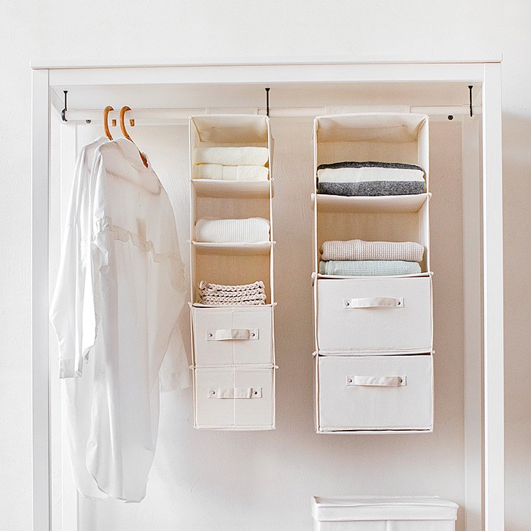 Bahannya terbuat dari bahan katun linen yang tahan air dan tahan lembab. Storage ini sangat efektif untuk menyimpan pakaian ataupun barang lainnya. Penggunaannya bisa digantung di dinding ataupun digantung di dalam lemari.
