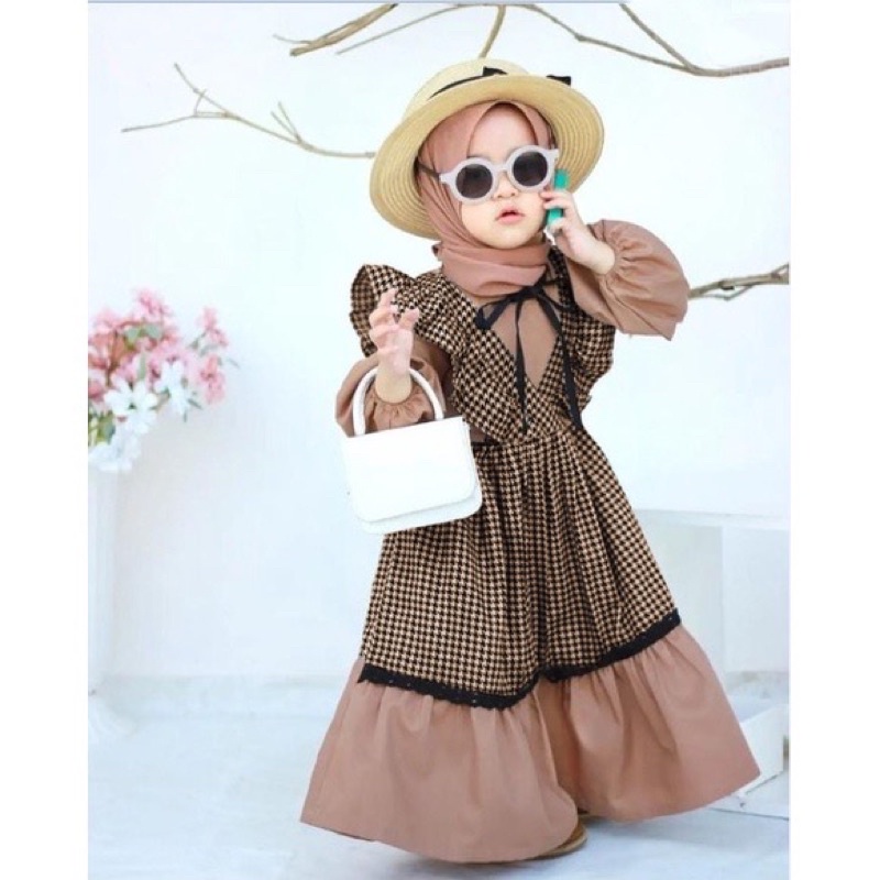 Bahannya terbuat dari bahan katun yang adem dan nyaman dikenakan oleh anak-anak. Desainnya gamis lebar dengan perpaduan kombinasi warna dan motif kotak-kotak. Tentunya anak perempuan Anda akan sangat menggemaskan menggunakan gamis ini.