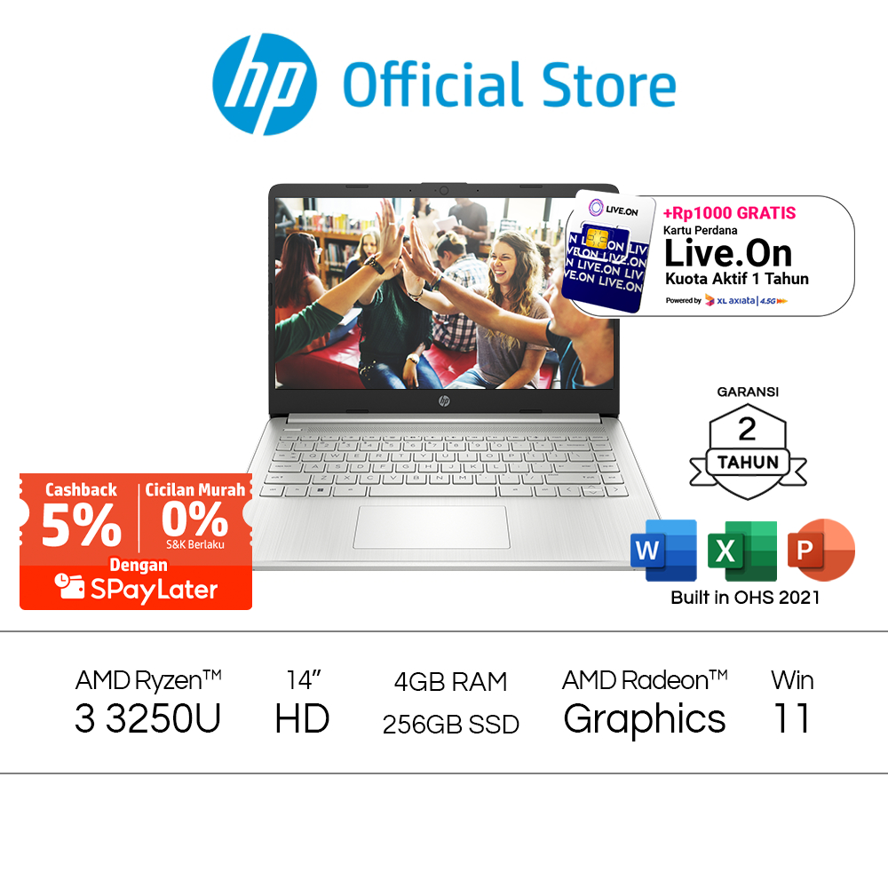 Laptop HP 14s-fq0591AU menawarkan desain elegan dalam warna natural silver. Ditenagai oleh prosesor AMD Ryzen™ 3 3250U dan sistem operasi Windows 11 Home, laptop ini memberikan kinerja yang baik untuk tugas sehari-hari. Tersedia pilihan memori 4 GB atau 8 GB, serta penyimpanan internal 256 GB SSD untuk kecepatan akses data yang tinggi. Layar 14 inci dengan resolusi HD (1366 x 768) menampilkan tampilan yang jernih dengan teknologi micro-edge dan BrightView, serta kecerahan layar sebesar 220 nits dan cakupan warna 45% NTSC.