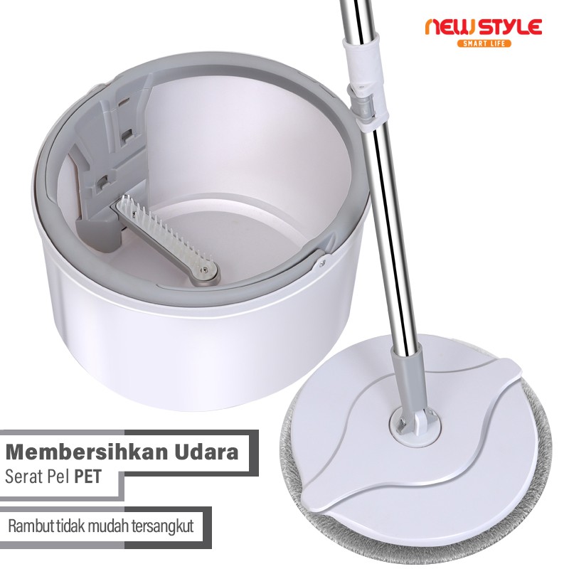 Newstyle Spin Mop D31 merupakan rekomendasi pertama kami. Alat hadir dengan 1 set tongkat pel dan wadah pel. Ini merupakan tipe alat pel yang memakai tenaga tangan. Produk memiliki panjang tiang pel 111 hingga 134 cm sehingga bisa disesuaikan. Lebar kain pelnya 25 cm. Ukuran ember airnya adalah 29 x 29 x 19 cm.