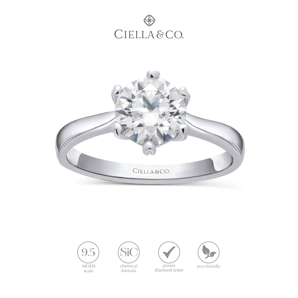 Salah satu produk andalan Ciella&Co. adalah Cincin Tunangan Solitaire 6 Gading yang memiliki berlian Moissanite berkualitas tinggi. Dengan ukuran 6,5mm dan berat 1,0 karat, berlian Moissanite ini menawarkan keindahan yang luar biasa dengan kualitas warna D dan kejernihan VVS1. Cincin ini terbuat dari perak 925 yang dilapisi dengan emas putih 18K untuk memberikan sentuhan kemewahan. Ciella&Co. juga memberikan kelengkapan lainnya seperti sertifikat batu resmi, kotak perhiasan eksklusif, garansi seumur hidup*, dan kesempatan replating gratis 1 kali per tahun. Dengan Ciella&Co., Anda dapat memiliki perhiasan yang indah, berkualitas tinggi, dan mendukung lingkungan serta etika yang baik.
