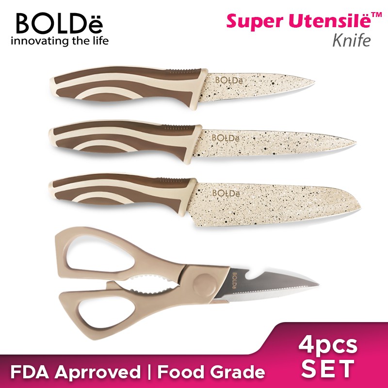 Masak-memasak menjadi lebih mudah dan praktis dengan pisau set dari BOLDe Electra. BOLDe kini hadir dengan peralatan memasak BOLDe Super Utensil Electra Series, terdiri dari fruit knife, cutter knive, meat cleaver, dan scissor yang dirancang khusus dengan granite model berwarna beige yang elegan.