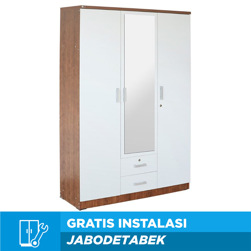Didesain dengan sistem knockdown yang mudah dirakit, precision maker, dan fast build, lemari ini juga dilengkapi dengan laci dalam, handle besi, dan kunci untuk keamanan. Cermin atas dan bawah menambah fungsi dan estetika dalam lemari ini. Dengan berat produk asli sekitar 57 kg, lemari ini adalah pilihan yang praktis dan modern untuk penyimpanan pakaian Anda.