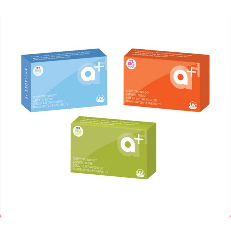 Diameternya yang cukup besar akan membuat pupil terlihat besar dan bulat seperti mata boneka. Softlense ini memiliki 3 varian warna Hazel, Grey, dan Blue. Softlense ini memiliki diameter 14.5 mm dan kadar air 55% sehingga nyaman digunakan sehari-hari. Softlense ini tersedia dalam ukuran normal hingga minus 10. Softlense A+ NEW merupakan softlense dengan masa penggunaan selama 6 Bulan.