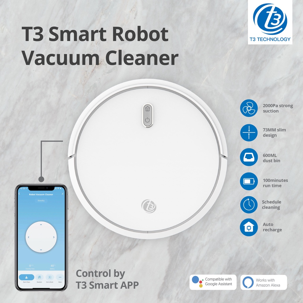T3 Smart Robot Vacuum Cleaner adalah robot penyedot debu pintar yang dilengkapi dengan sensor anti-jatuh, pengisian otomatis, dan menghindari rintangan. Memiliki kapasitas tempat debu 600 ml dan baterai Li-ion 2600mAh yang dapat bekerja hingga 100 menit. Dilengkapi juga dengan filter HEPA untuk menyaring debu halus. Robot ini dapat dikendalikan melalui aplikasi T3 Smart, dan memiliki 4 mode pembersihan yang berbeda, termasuk mode acak, tepi, spiral, dan ruangan tunggal. Selain itu, memiliki sensor anti-tabrakan dan anti-menggulung, serta sistem pemutaran otomatis saat menghadapi karpet atau lantai kayu dan ubin.