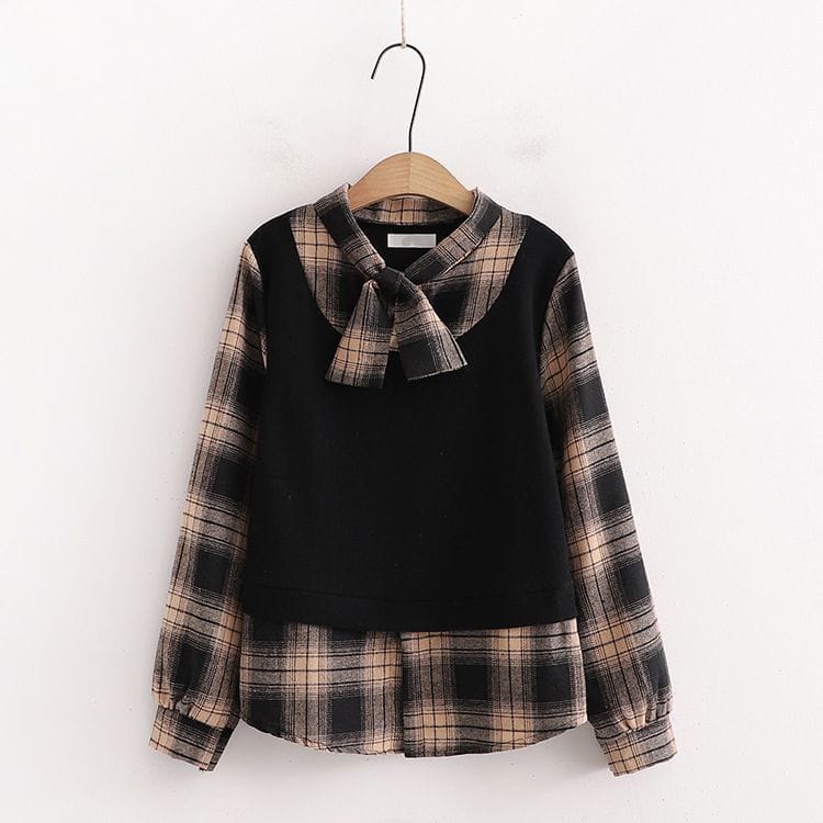 1. Atasan O-Neck Lengan Panjang Model Longgar Casual Motif Kotak untuk Wanita