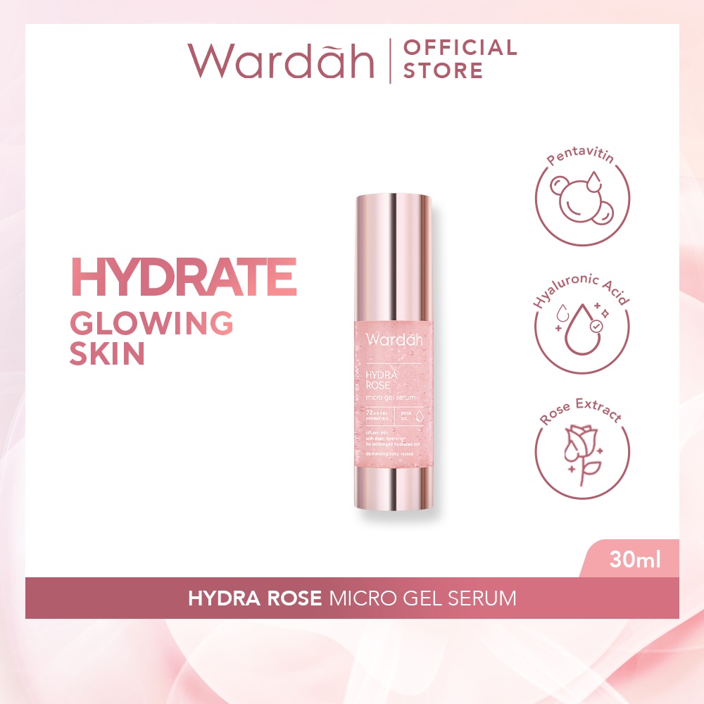 Wardah Hydra Rose Micro Gel Serum adalah serum dengan kandungan 72 Hours Hydrating Active dan Avalanche Rose Oil yang memberikan hidrasi dan menjaga kelembapan kulit. Dengan butiran HydraMoist Micro Gel yang lembut, serum ini melebur ke dalam setiap lapisan kulit untuk memberikan kelembapan ekstra sepanjang hari. Serum ini memiliki banyak manfaat, seperti mengembalikan skin barrier yang rusak, menjaga kelembaban kulit hingga 72 jam, memberikan efek antioksidan dan menenangkan kulit. Dengan beads yang pecah saat dioleskan, serum ini memberikan efek lembab dan halus. Selain itu, serum ini juga melindungi kulit dari faktor lingkungan penyebab kulit stres, serta telah diuji secara dermatologis, non-comedogenic, dan bebas alkohol.