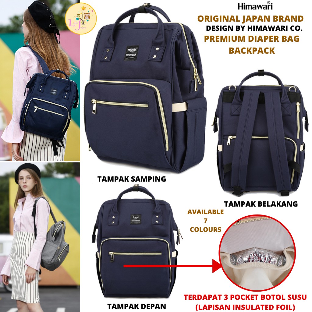 Diaper Bag ORIGINAL JAPAN Brand Himawari tentu menjadi pilihan tepat untuk perlengkapan bayi. Produk ini adalah tas impor berkualitas tinggi. Tas keren ini terbuat dari bahan poliester premium sehingga berkelas. Produk ini akan memudahkan membawa perlengkapan bayi saat bepergian. Tas ini hadir dengan 7 piluihan warna. Dengan ukuran 26,5cm x 19cm x 40cm, tas ini desainnya keren. Ada solid handle yang membuat tas bisa ditenteng selain bisa juga jadi backpack. Tas dilengkapi padded foam sehingga tubuh Anda tetap nyaman saat menopang beban tas yang berat. Kompartemen tas ini cukup luas sehingga bisa membawa banyak barang. Ada juga resleting khusus langsung terhubung ke dalam tas, jadi, Anda lebih mudah mengambil barang. Produk memiliki 1 kantong bukaan atas, 6 saku di bagian dalam tas, saku depan dengan thermal insulation, dan saku belakang.