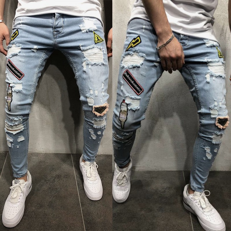 Kalau kamu suka berubah penampilan beda kamu bisa mengenakan celana jeans dengan model ripped. Celana yang terkesan sobek ini bisa dipadukan dengan berbagai atasan santai seperti kaos maupun hoodie untuk mendapatkan gaya ala Street Style. Slim Men's Ripped jeans Ankle Length Holes Denim Seluar Trousers Sky Blue adalah salah satu produk celana Ripped jeans yang bisa kamu dapatkan di Shopee.