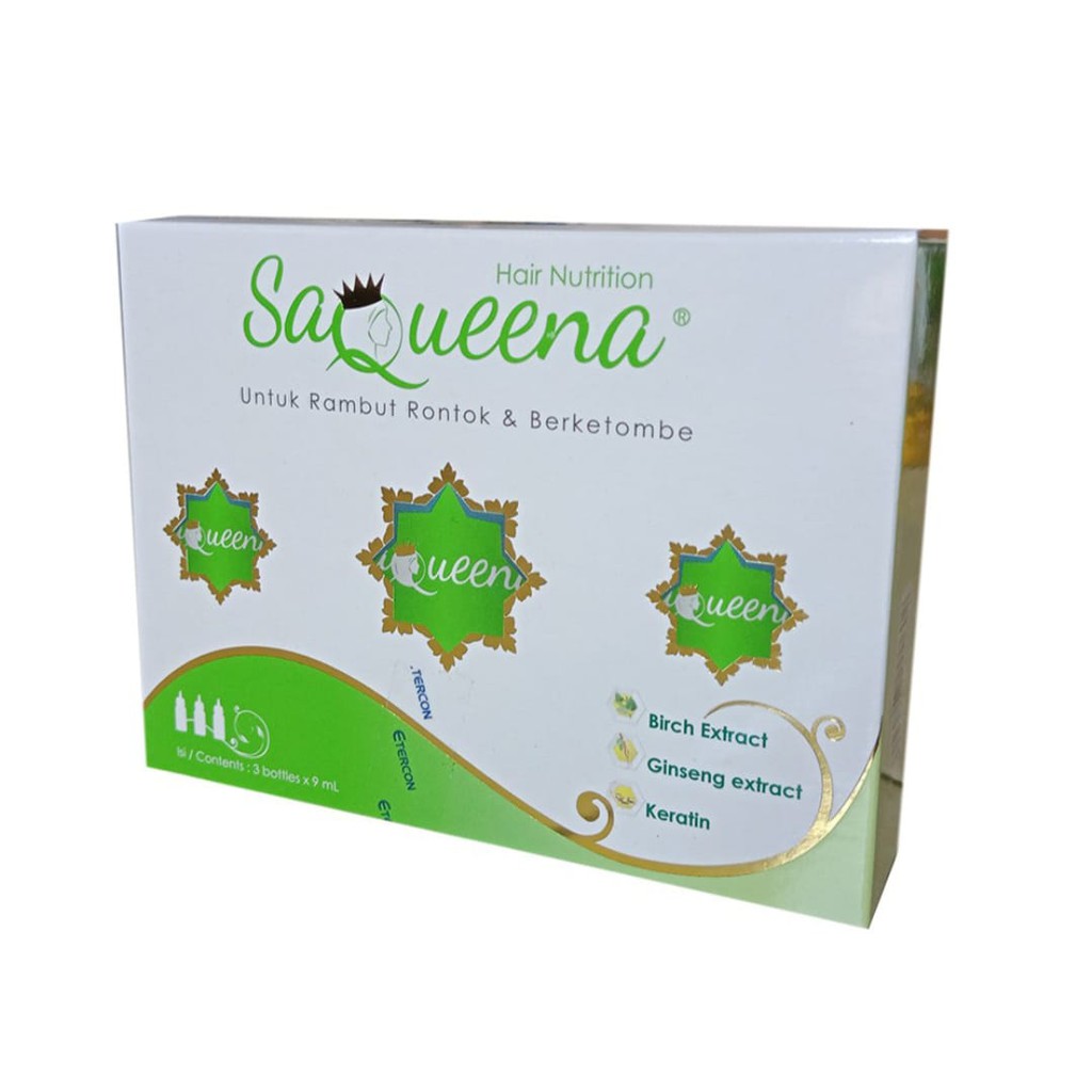 Saqueena Serum adalah serum rambut herbal yang dirancang khusus untuk mengatasi berbagai masalah rambut seperti rambut rontok, ketombe, bau, dan lepek. Mengandung Birch Extract, Gingseng Extract, dan Keratin, serum ini memberikan nutrisi yang dibutuhkan rambut dan membantu mengurangi kekusutan serta kerontokan. Cocok digunakan oleh pemakai jilbab, produk ini hadir dalam kemasan dus berisi tiga botol kecil ukuran 9ml, dengan promo khusus "3 botol beli 1 botol gratis." Dengan Saqueena Hair Nutrition, Anda bisa mendapatkan rambut yang lebih sehat dan terawat tanpa masalah ketombe dan lepek.