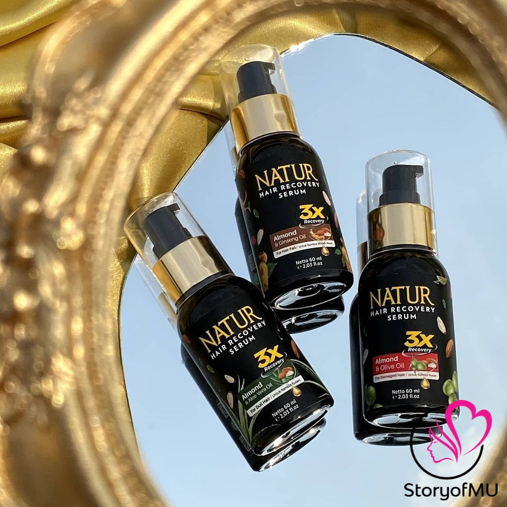NATUR Hair Recovery Serum merupakan serum perawatan rambut dengan berbagai varian, seperti Almond & Aloe Vera Oil, Almond & Ginseng Oil, dan Almond & Olive Oil. Setiap varian memiliki manfaat unik, seperti melebatkan rambut, mengembalikan kilau pada rambut yang kusam, merawat kekuatan batang rambut agar tidak mudah patah, dan membantu memperbaiki rambut yang rusak. Produk ini hadir dalam ukuran 60ml dan telah terdaftar di BPOM, sehingga memberikan perawatan alami untuk rambut yang kusam, rusak, dan rontok, agar rambut kembali sehat, lembut, dan berkilau.