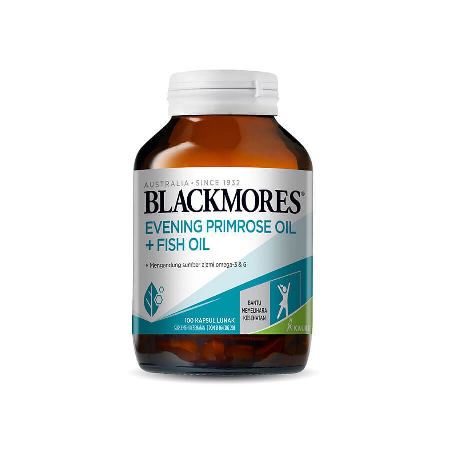 Blackmores Evening Primrose Oil + Fish Oil adalah suplemen kesehatan tubuh dan kulit yang mengandung sumber alami Omega 3 dan evening primrose oil. Selain menyehatkan kulit, suplemen ini juga membantu mengurangi nyeri akibat ketidakseimbangan hormon saat PMS dan menopause.