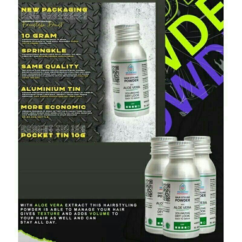 Hair Powder dari Hairnerds Professional merupakan inovasi produk styling rambut berbentuk bubuk atau powder yang mudah digunakan dan tidak lengket. Cocok untuk semua jenis dan gaya rambut, dengan daya rekat (hold) 4/5, daya kilau (shine) 1/5, dan memberikan volume (volume) 5/5. Cara penggunaannya cukup taburkan langsung ke area rambut yang diinginkan, ratakan dengan tangan, dan atur sesuai gaya yang diinginkan. Dibuat dengan bahan-bahan alami, produk ini aman dan tidak menimbulkan efek samping seperti panas, gatal, atau kulit terkelupas. Dengan ekstrak lidah buaya, hair powder ini mampu mengatur rambut, memberikan tekstur, dan menambah volume sehingga hasilnya bisa bertahan sepanjang hari.
